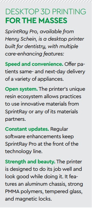 ,Many dental practices have “gone digital.” They’re using digital radiography and, in many cases, intraoral scanners and CAD/CAM equipment. But what about 3D printing?, ,Dental 3D printers enable dentists to create night guards, clear aligners, castable and pressable restorations, splints, and dentures. However, for Sully Sullivan, DDS, the most valuable use and best ROI comes from the things dentists do every day—models and surgical guides. “If you’re doing 10 surgical guides a month, each between $150 and $300, that can add up to $3,000 per month,” Dr. Sullivan explained. “When you bring that in-house with 3D printing, the cost is around $20 per guide, saving you $1,800 per month.”, ,For Dr. Sullivan, one of the biggest reasons 3D printing has worked well in his office is because it’s team-driven. “Team members are empowered and the assistant’s role now encompasses both chairside care and lab work,” he said. “They take ownership of the process, which keeps them engaged and excited about their work.”,