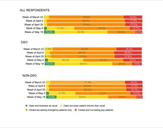 The ADA HPI poll collected data from more than 6,500 dentists in private practice during the week of May 18 who also reported that 58% of practices were fully paying their staffs, compared to 11% pully paying them during the week of April 6.