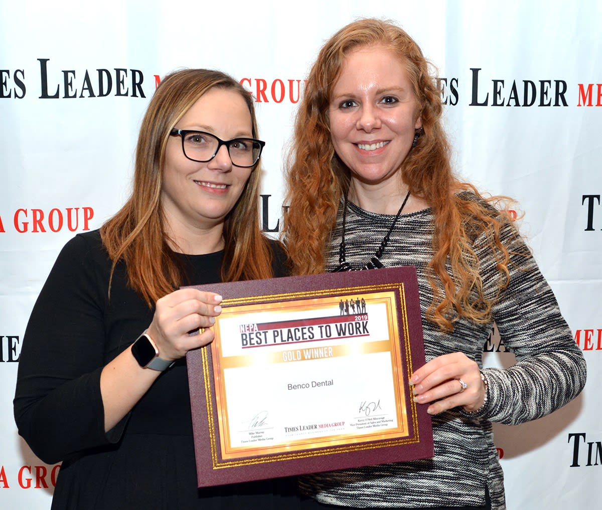 1.BencoDental_ TL BestPlacesNEPA19.jpg: For the third consecutive year, Benco Dental receives recognition as one of the 2019 Best Places to Work in Northeast Pennsylvania by Times Leader Media Group, a collection of print and digital products that provide coverage of the Scranton/Wilkes-Barre metropolitan area. The ranking considered input from readers of The Times Leader, a seven-day publication with an audience of more than 133,709, that is the flagship of media group. Benco Dental, the nation’s largest privately-owned dental distributor, earned Gold Award status in the competition based on feedback obtained through The Times Leader print publication and website. Shown representing Benco Dental are members of the Culture and People team, Joanne Stitzer, Associate Chief Customer Advocate and Michelle Waschek, Executive Administrative Assistant. (Photo courtesy Tony Callaio | For Times Leader)