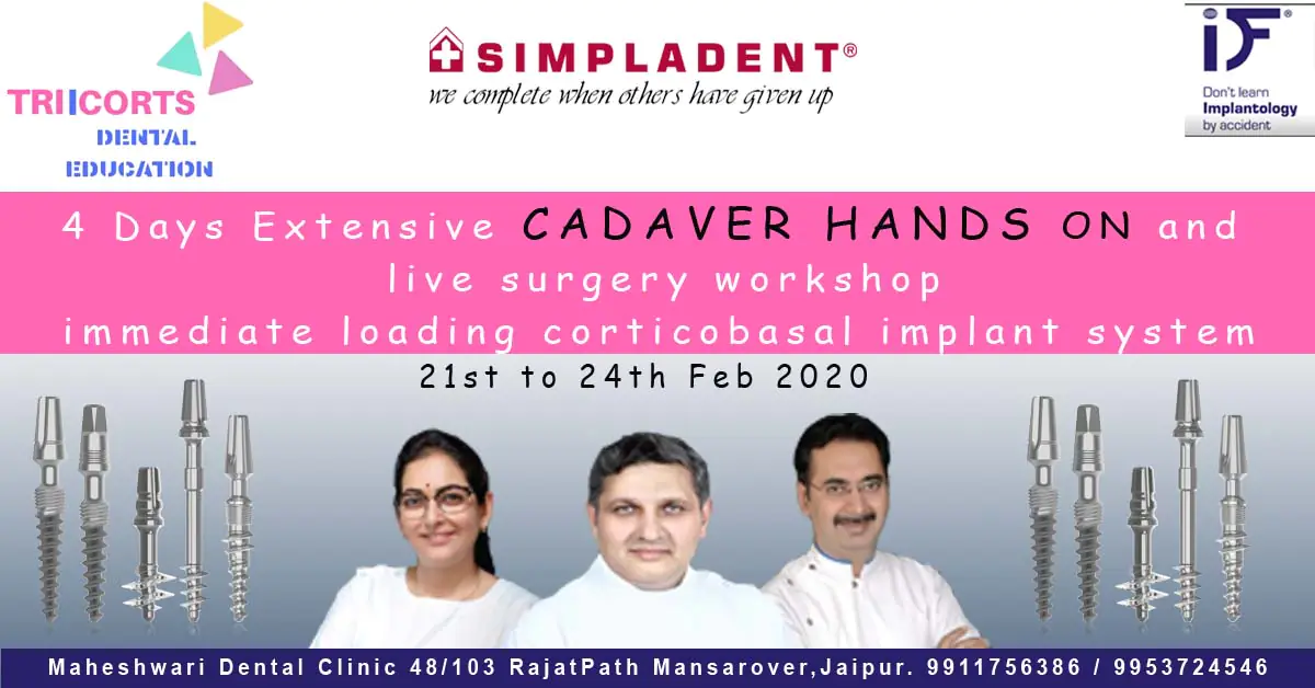 TRIICORTS Dental Education in Association with Simpladent Implant Solutions & International Implant Foundation Welcomes Budding & Experienced Implantologist’s to take part in the 4 days Extensive Cadaver Hands on and Live Surgery Workshop on Immediate Loading Dental Implant System.