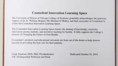 In recognition of Cosmedent’s support, the UIC College of Dentistry recently dedicated the Cosmedent Innovation Learning Space on October 29th. The dedication was hosted by the Dean, Dr. Clark Stanford and Mark J, Valentino, the Associate Dean for Advancement plus the faculty who recognized the gift of Cosmedent’s co-founders, Dr. Buddy Mopper and Michael O’Malley. Cosmedent stands behind UIC’s mission of Changing the Future of Oral Health. This new, intimate learning space fosters the sharing of knowledge, creativity, innovation among students and inventive teaching by the faculty. Cosmedent is happy to contribute to fostering the growth of dental students and looks forward to a long partnership with UIC ahead.