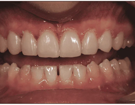 - Indirect ceramic veneers of the maxillary teeth to close the spaces and add length. Gingival sculpting prior to veneer placement could add 1 to 2 mm of height to the teeth as well. Whitening of all other teeth would be included, as well as direct composite bonding to close the lower diastema.