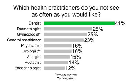 According to the survey, 41% of American adults reported they do not get to the dentist as often as they’d like, coming out 13% higher than the next health practitioner, dermatologists at 28%.
