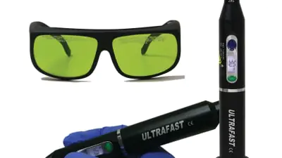 The Ultrafast is an extraordinary cordless laser with an ergonomic design and superior performance. It delivers 3W constant and 5W pulsed infrared power at 808nm with its distinctive green aiming for enhancing visual clarity during procedures. The sleek wireless design eliminates cords, reduces setup time, and clears counter space due to its small size. It comes with easily disposable fiber tips and slide-in laser shield protecting loupe operators. It is extremely durable with a scratch resistant solid aircraft aluminum body. It runs for 45 minutes continuously on a single charge, weighs only 3.5 oz, and measures 6.4 inches. The product is built on the same Photonic Platform as the award-winning FUSION Curing Light to further expand functionalities and increase daily uses for higher ROI.