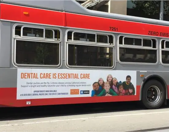 Dugoni’s marketing and communications team worked to secure advertising space at no cost to the school thanks to the transit agencies’ pro bono PSA program for nonprofit organizations.
