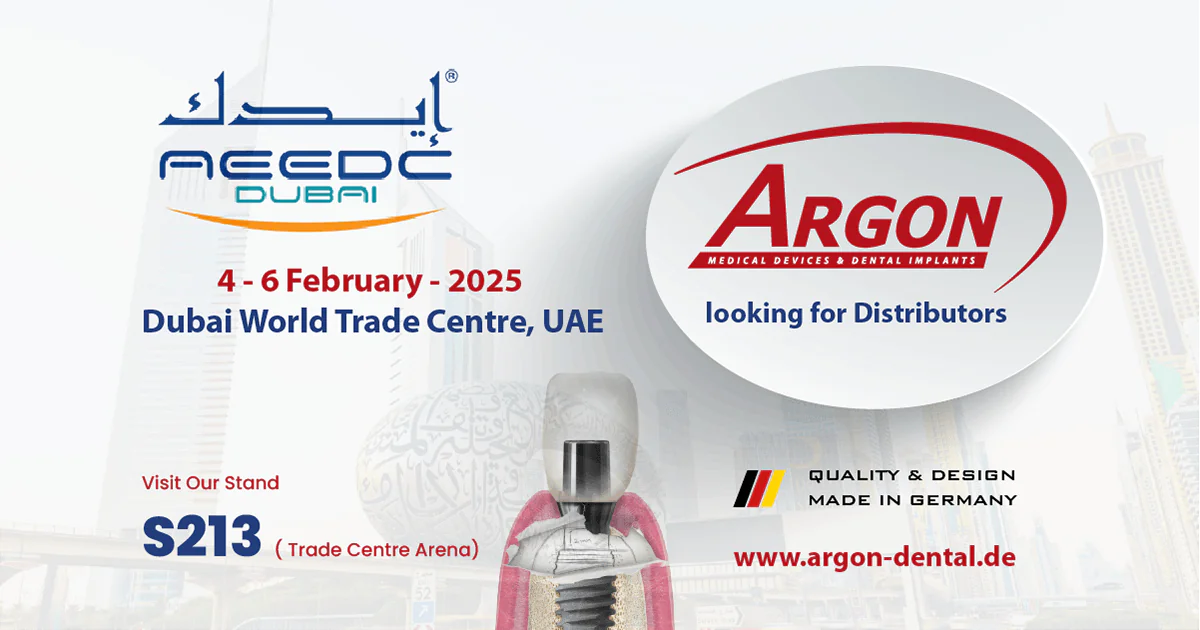 Are you ready to transform your business with premium dental implant solutions? Argon Dental is looking for ambitious and ethical distributors from the MENASA (Middle East, North Africa, and South Asia) region to join our growing global network. This is your chance to partner with a world-renowned German implant company at AEEDC 2025, the second-largest dental exhibition in the world, from February 4–6, 2025, in Dubai.