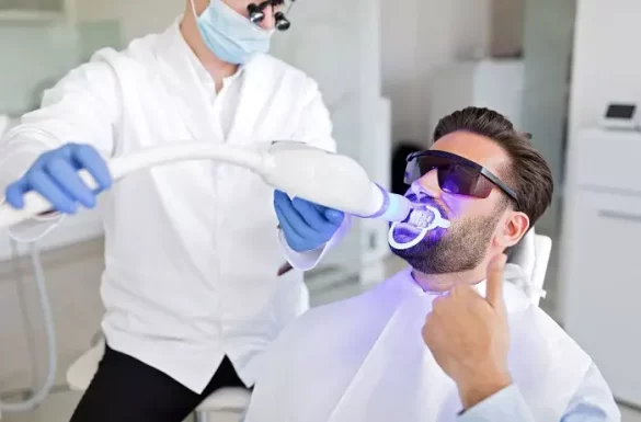 Application of Whitening Agent: A high-concentration bleaching gel, usually containing hydrogen peroxide or carbamide peroxide, is applied to your teeth. Some treatments use a special light or laser to enhance the whitening process.