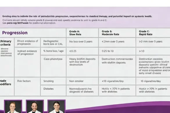 While staging measures the current severity, grading evaluates how quickly the disease is likely to progress in the future. grading is based on several criteria, including the rate of bone loss compared to the patient’s age, the presence of risk factors, and radiographic evidence. There are three grades: