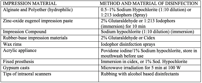 - Spray disinfectant can be used for chair side disinfection followed by packing in zip lock bags before sending the impressions to laboratory for pouring.