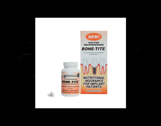 BONE-TITE is an over-the-counter dietary supplement product developed in conjunction with prosthodontists, periodontists, and other dental professional experts in bone metabolism and bone growth for use with patients that may require nutritional insurance before and after dental implant procedures.