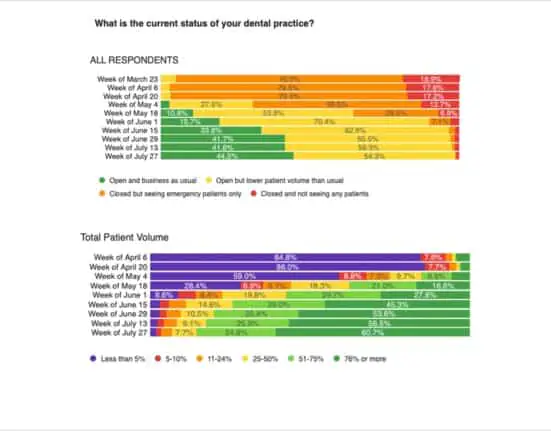 Nearly 99% of dental practices were open at the end of July, with a split of 44.5% seeing business as usual and 54.3% open but with lower patient volume than usual, according to the latest ADA Health Policy Institute biweekly poll.