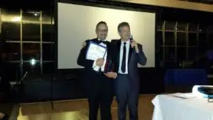 Patterson Dental CEO Paul Guggenheim receives the 2015 San Fernando Valley Dental Society Foundation Humanitarian Award from Dr. Michael Simmons, 2015 President of the San