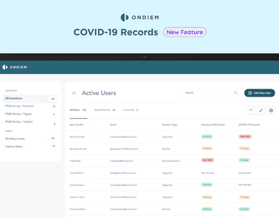 onDiem’s COVID-19 records tracking service is part of a larger Digital ID credentialing service that launched earlier this year. That service uses automated primary source verification to monitor current state licenses and check compliance with regulating entities like OIG, SAM, DEA, and NPI. onDiem customers who opt into the Digital ID service will automatically have access to the new COVID-19 feature.