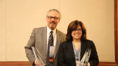 Caption: Mike Smurr, Director of Marketing, Merchandise, for Patterson Dental and Marguerite Walsh, Vice President, Product Merchandising for Henry Schein Dental accept their awards.