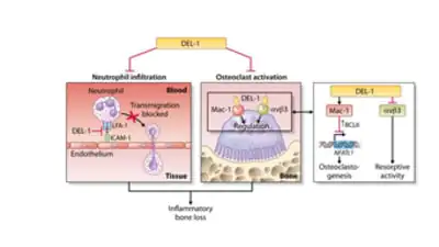 Further experimentation in vitro with human osteoclasts and in vivo in mice identified a portion of the Del-1 protein that was particularly important for containing osteoclast activity, though additional parts of the molecule were needed to have the most potent inhibition of inflammation and bone loss. In further mechanistic experiments using different parts of the protein, the researchers were able to dissociate the anti-inflammatory action of Del-1 from its anti-osteoclastogenic action.