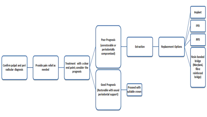 Chief complaint >>> Examination >>> Diagnosis >>> Treatment goal (Consider factors like Restorability, periodontal issues, prognosis)>>> Managing the peri-apical pathology with RCT >>> Crown lengthening procedure >>> tooth preparation >>> best crown options suggested by the dental practitioner for the case (Monolothic crown; preferably sintered or milled crown for superior fit)>>> Occlusion check and adjustment at bisque stage>>>Crown cementation