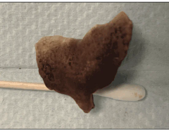 Treatment was performed by removing the calculus mass and debriding other supragingival calculus present. The largest section of the mass measured 3.8 × 2.0 cm (Figure 4), and other fragments were removed that adhered to the lingual and facial surfaces of teeth Nos. 20 to 29 (Figure 5).