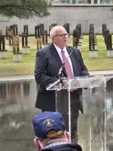Bryan Chrz, D.D.S., who helped to establish and run the dental identification section of the Oklahoma City bombing response, speaks during a ceremony that honored