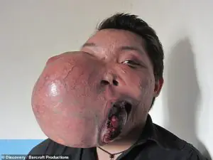 Main Content Adrián Espino, 23, was left suicidal by the growth, which developed from a small ‘bruise’ on his cheek at six-years-old. This growth was