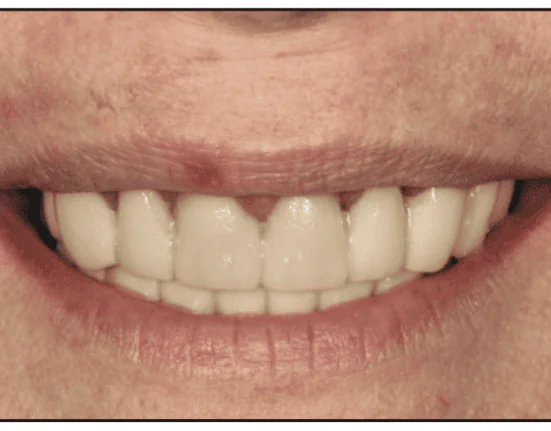 Oral rehabilitation with implants is a possible solution since SS does not affect bone healing and osseointegration.2,5,12 Binon and Fowler13 presented a case report with mandibular-osseointegrated implants and a fixed prosthesis that remained functional and stable after 13 years of followup. Due to the difficulties SS patients have wearing removable prostheses, a fixed transitional prosthesis during the surgical stage is key. Drew et al14 proposed the stage approach, in which hopeless teeth are kept in strategic positions as abutments to support an interim fixed prosthesis during the surgical stage, making the transition from a terminal dentition to a full-arch reconstruction easier. Some of the advantages of this technique include increased patient comfort, soft-tissue management, protection of grafted areas, alveolar bone preservation, and surgical templates for the position of future implants.